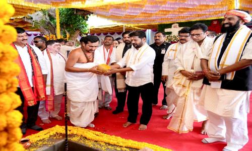 ఇ నివాస్ న్యూస్ - తెలంగాణ / జయశంకర్ భూపాలపల్లి / ప్రతినిధి : ప్రసిద్ధ పుణ్యక్షేత్రం కాళేశ్వరం ముక్తే శ్వర స్వామి దేవాలయం అభివృద్ధి కోసం రూ.198. కోట్ల వ్యయంతో చేపట్టను న్న పునర్ అభివృద్ధి నిర్మాణ పనులకు,అలాగే రూ.3.70 కోట్ల అంచనా వ్య యంతో నిర్మించనున్న కాళే శ్వరం బ స్టాండ్ పనులకు రాష్ట్ర ము ఖ్యమంత్రి ఎనుముల రేవం త్ రెడ్డి సోమవారం శంకు స్థాపనచేశారు.ఈకార్యక్రమంలో రాష్ట్ర మంత్రులు తుమ్మ ల నాగేశ్వరరావు,దుద్దిళ్ల శ్రీధర్ బాబు,ఉత్తం కుమార్ రెడ్డి,పొంగులేటి శ్రీనివాస్ రె డ్డి,పొన్నం ప్రభాకర్,అడ్లూరి లక్ష్మణ్,గడ్డం వివేక్,పార్ల మెంట్ సభ్యులు వేంరెడ్డి, నరేందర్ రెడ్డి,వంశీకృష్ణ పా ల్గొన్నారు. ఈసందర్భంగా ముఖ్యమంత్రి కాళేశ్వరం ముక్తేశ్వర స్వామి వారిని ద ర్శించుకునిమహారుద్రాభిషేకంనిర్వహించారు. అనంతరంశుభానందదేవిఆలయంలో ప్రత్యేక పూజలు నిర్వ హించారు.దేవాదాయ శాఖ ప్రిన్సిపల్ సెక్రటరీ శైలజ రా మయ్యర్,కమిషనర్ హను మంతరావు ముఖ్య మం త్రితో పాటు రాష్ట్ర మంత్రు లకు స్వామివారి శేష వస్త్రా లు,తీర్థ ప్రసాదాలుఅందజేసి పట్టు వస్త్రాలతో ఘనంగా స న్మానించారు.కాళేశ్వరం వి చ్చేసిన ముఖ్యమంత్రికి జిల్లా కలెక్టర్ రాహుల్ శర్మ పుష్ప గుచ్ఛం అందించి ఘన స్వాగతం పలికారు.